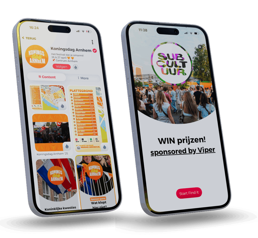 Breng je bezoeker, partners en (praktische)informatie samen in één handige omgeving. Bereik jouw publiek via pushberichten, activerend content of doe marktonderzoek via onze gamification functies.